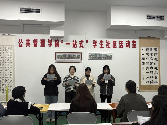 随后,四个小组依次登台展开激烈的朗诵比赛。首先由2024级社会工作班王桂萍带队朗诵《中华颂》。“中华是我们的家,我们的家叫中华!”他们用激昂的声音,对祖国的热爱表达得淋漓尽致。