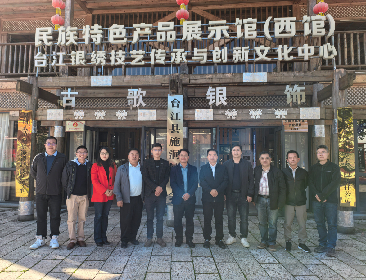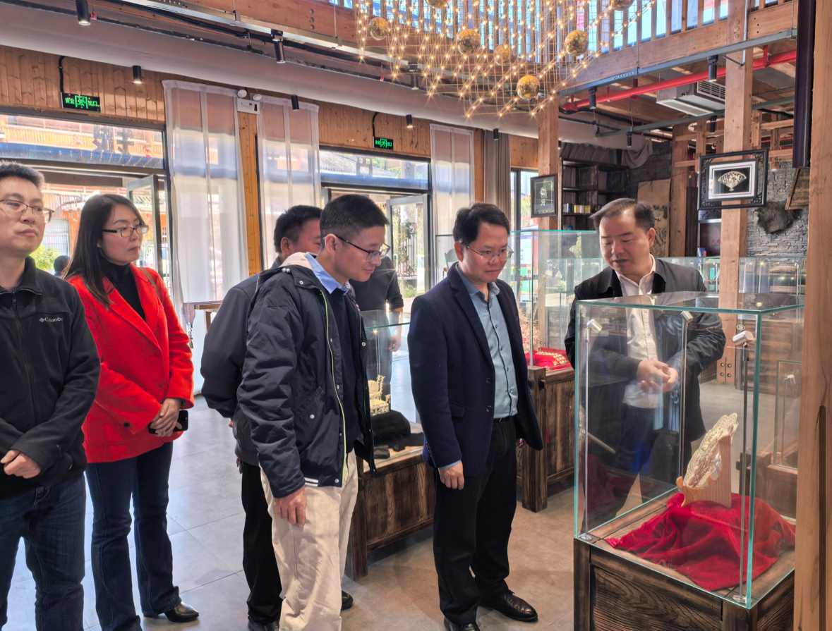 随后,调研组来到台江银绣技艺传承与创新文化中心。精美的苗族银饰和刺绣作品令人赞叹。大家认真听取了关于非遗技艺保护、传承人培养、产品创新及市场开拓情况的介绍,并就如何将丰富的民族文化资源与乡村旅游、文创产业更深度地融合,打造具有施洞特色的文化品牌,从而赋能乡村振兴进行了深入交流。