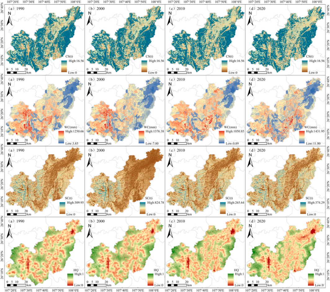 Fig. 3.The spatial and temporal distribution of ES is organized from top to bottom as follows: carbon storage (CS), water conservation (WC), soil conservation (SC), and habitat quality (NPP), in five rows arranged from left to right: (a) 1990, (b) 2000, (c) 2010 and (d) 2020.
