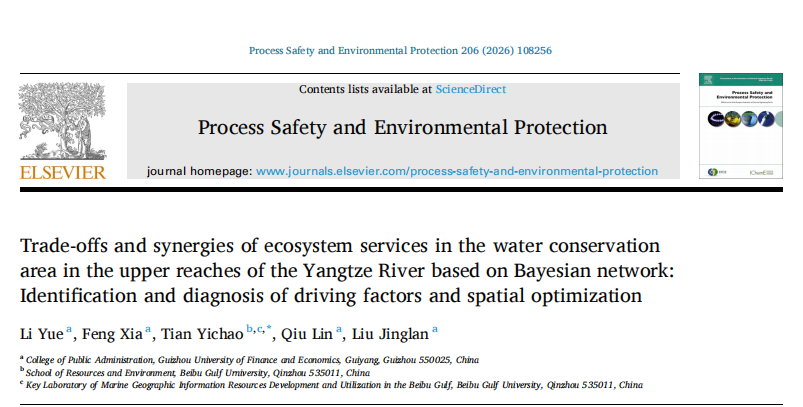 本网讯:(刘静兰 图文报道)近日,我院李月副教授指导研究生在国际权威期刊《Process Safety and Environmental Protection》发表论文。作为长江上游生态系统服务研究领域的重要研究成果,该论文聚焦贵州马尾河流域(长江上游生态脆弱区)生态系统服务复杂关系的核心议题,将生态系统服务权衡协同关系重构为人类活动干扰下多类生态系统服务间“此消彼长”“同增同减”的动态互作过程性现象,基于长江上游生态脆弱区的地域特征,围绕碳储存、水源涵养、土壤保持和栖息地质量四类生态系统服务,构建基于“贝叶斯网络-空间格局”框架的生态系统服务权衡协同强度模型及其空间分布指标体系,并实证揭示生态系统服务关系的空间格局与驱动机制,为长江上游生态修复与空间优化提供科学依据。
